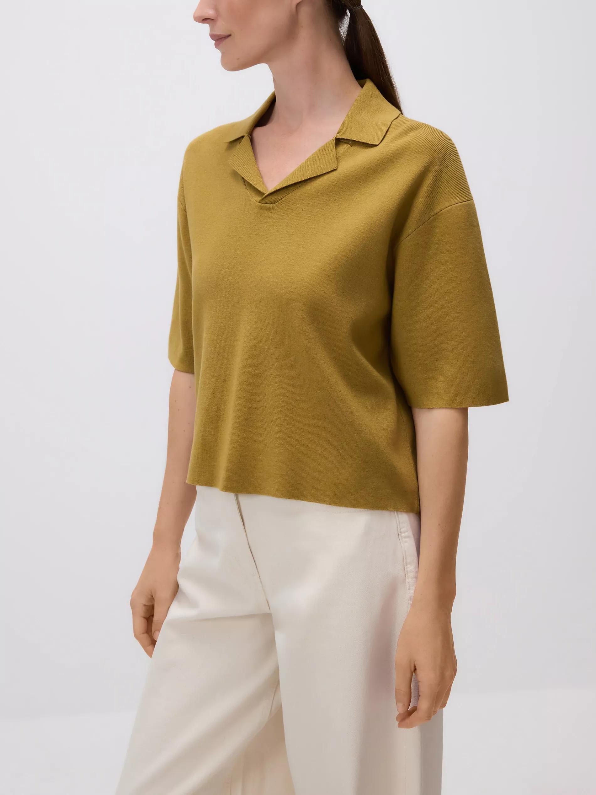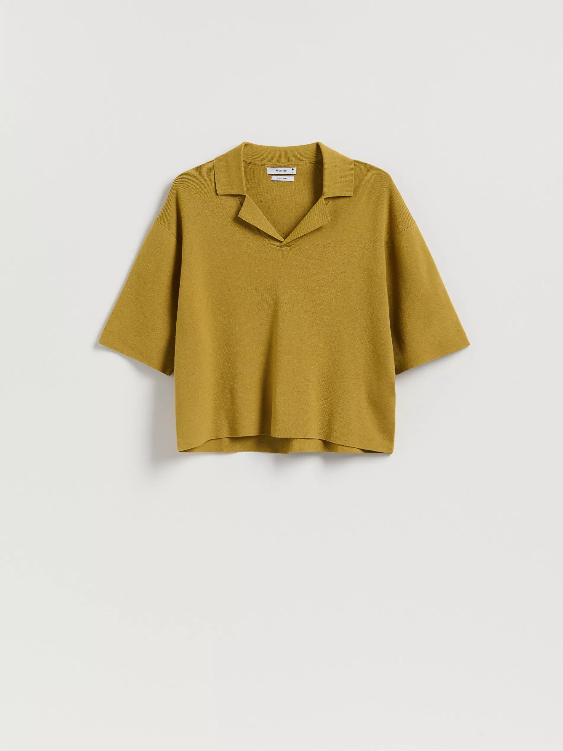Reserved - Blouse with collar - warm olive - 022GS-19X - V-neck collar,dropped shoulders,relaxed short sleeves